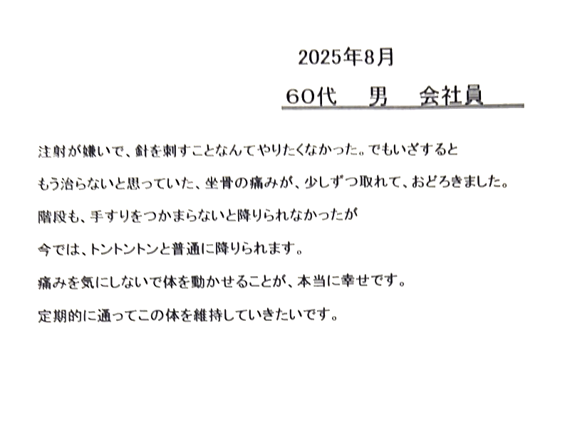 でもいざ治療を受けてみると、「もう治らない」と思っていた、坐骨の痛みが、少しずつ取れて、驚きました。